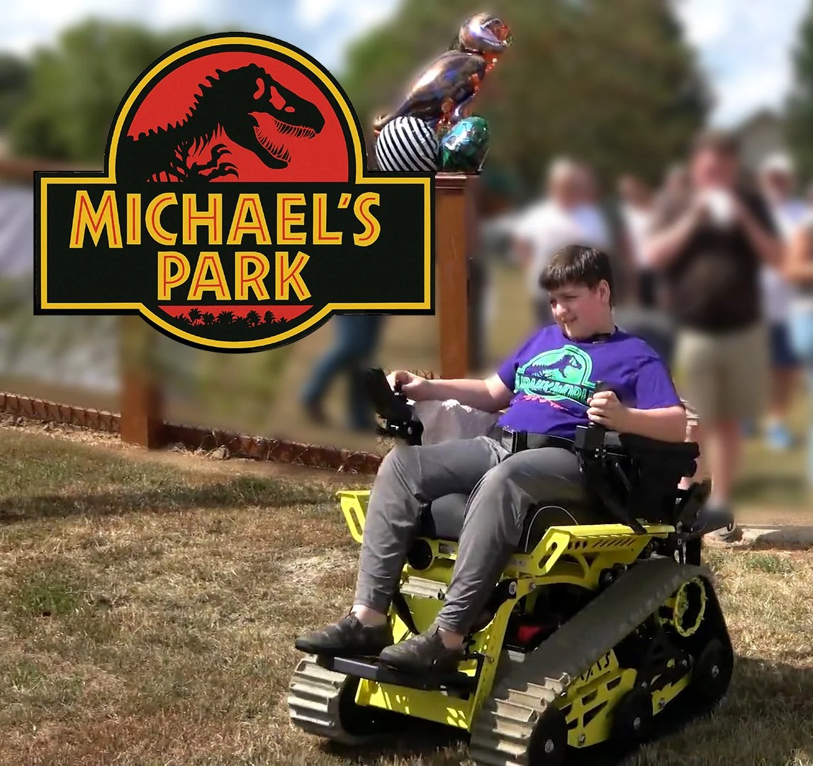 The gathering, held in “Michael’s Park”, transformed his backyard into a Jurassic wonderland. From towering dinosaurs to custom signage and themed decorations, every detail of the event was tailored to celebrate Michael’s love for dinosaurs. The highlight of the day came when Michael was presented with a motorized all-terrain wheelchair, known as an Action Track Chair. This remarkable piece of adaptive equipment was made possible through the generosity of donors and the commitment of the Midwest Outdoor Adaptability Foundation. With this chair, Michael now has the freedom to explore the outdoors, move alongside his peers, and experience a level of independence that is truly life-changing.